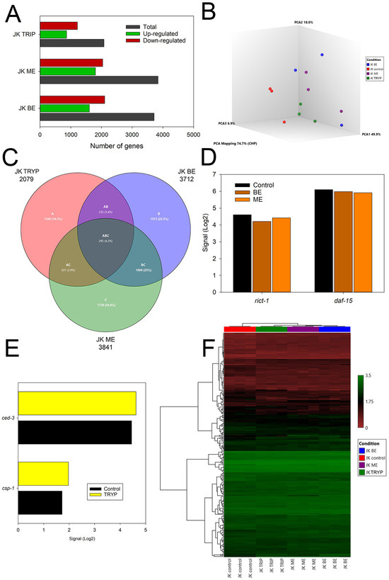 Differential gene expression analysis. (A) Genes up- and down-regulated by the treatments with the lead molecule tryptophan-betaxanthin, and the derivatives tryptophan benzyl ester-betaxanthin and tryptophan methyl ester-betaxanthin. (B) PCA analysis. (C) Venn diagram. (D) Expression levels of mTOR dysregulated genes in C. elegans treated with tryptophan benzyl ester-betaxanthin and tryptophan methyl ester-betaxanthin. (E) Expression levels of caspases dysregulated genes in C. elegans treated with tryptophan-betaxanthin. (F) Heatmap showing the triplicate assays for the conditions control, tryptophan benzyl ester-betaxanthin, tryptophan methyl ester-betaxanthin, and tryptophan-betaxanthin.
