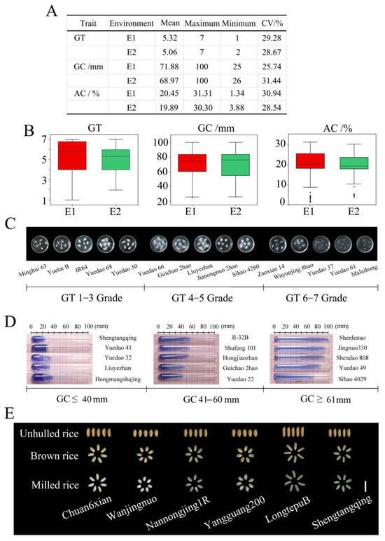 The basic statistics of the mean values, maximums, minimums, and coefficients of variation (CVs) of GT, GC, and AC are listed in Figure 1A. For the GT trait, the mean value was 5.19 in two environments, E1 and E2, with the CV ranging from 28.67% to 29.28% (Figure S1A). Figure 1B shows the GT distribution of the 173 samples in the E1 and E2 environments. The Minghui 63, Chuan 6xian, and Ningjinghui 260 varieties had high GTs, while Yuedao 37, Jindao 1007, and Zhongjing 131 had low GTs. The grade of GT was 6–7 (Figure 1C). For the GC trait, the mean values ranged from 68.97 ± 21.68 mm to 71.88 ± 18.50 mm. The CV was 28.59% in the two environments (Figure 1A). The GC distribution of the 173 samples in the E1 and E2 environments is shown in Figure 1B and Figure S1B. The samples of Liuyezhan, Malaihong, and Yuedao 41 had a hard GC of ≤40 mm (Figure 1D). The samples of Guichao 2hao, Nannongjing 1R, and Arias had a middle GC of 41–60 mm (Figure 1D). The samples of Shenlenuo, Zhongjing 131, and Luohanhuang had a soft GC of ≥61 mm (Figure 1D). For the AC trait, the maximum value was 31.31%, and the minimum value was 1.34% across the two environments (Figure 1A and Figure S1C). The CV ranged from 28.54% to 30.94% (Figure 1A). Figure 1B shows the AC distribution of 173 accessions in the two environments. The Shengtangqing variety had the highest AC of 29.34%. The Lincangwazuhangu variety had the lowest AC of 3.07%. The unhulled rice, brown rice, and milled rice varieties with different ACs are displayed in Figure 1E. These results indicate that there are abundant phenotypic variations in GT, GC, and AC among the 173 accessions, laying a foundation for mining elite variations related to GT, GC, and AC.