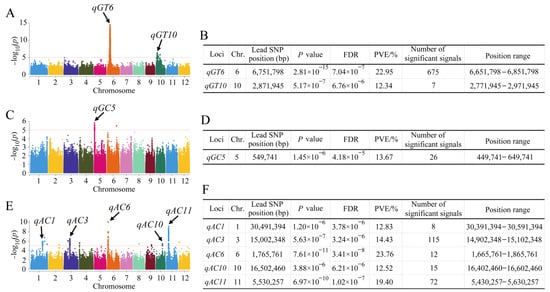 QTLs identified for GT, GC, and AC through GWAS in rice. (A) Manhattan plots for GT of the whole population of 173 rice accessions. (B) Information about the identified QTLs for GT. (C) Manhattan plots for GC of the whole population of 173 rice accessions. (D) Information about the identified QTLs for GC. (E) Manhattan plots for AC of the whole population of 173 rice accessions. (F) Information about the identified QTLs for AC. Negative log10 transformed p-values are plotted on the vertical axis, and dots above the red dashed line show the significant SNPs in the QTL region. The QTLs identified are shown by the black arrows. FDR, false discovery rate; PVE, phenotypic variation explained.