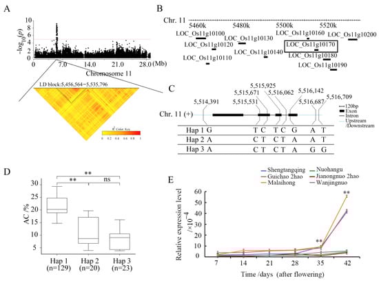 Identification of the candidate genes for the QTL qAC11 for AC as determined by integrated analyses of GWAS and gene expression data in rice. (A) Identification of LD block of qAC11. Y axis means negative log10 transformed p-values and dots above the red line show the significant SNPs in the QTL region. Pairwise LD was determined by calculation of r2 (the square of the correlation coefficient between SNP states). (B) Identification of candidate genes in the region of qAC11. (C) Haplotypes of LOC_Os11g10170 associated with AC in rice. (D) Box-plots of AC in accessions containing the different haplotypes. (E) Expression analysis of candidate gene LOC_Os11g10170 in six materials with different AC values at different periods after flowering. The relative expression values were normalized to the rice UBQ gene. Error bars indicate standard deviation, and asterisks indicate significant differences using Student’s t-test (** p < 0.01). ns means no significance.