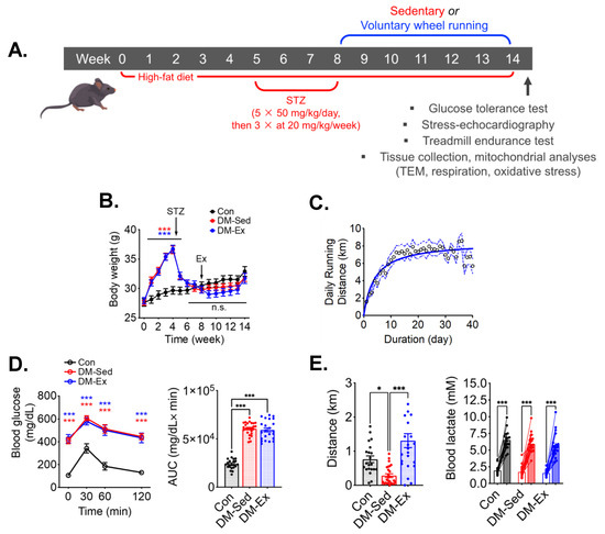 A combination of HFD and STZ injections induces severe diabetes with exercise intolerance in mice. (A) Protocol for diabetes induction and exercise intervention. STZ, streptozotocin. (B) Body weight during the course of study. Ex, the start of exercise intervention. n.s., not significant. n = 18, 23, 21 for Con, DM-Sed, and DM-Ex, respectively. (C) Daily running distance in the DM-Ex group. Dotted line, the 95% confidence intervals. (D) Left, blood glucose during GTT and area under the curve (AUC) taken at the end of GTT. ***: p < 0.0001 compared with Con (one-way ANOVA with post hoc multiple comparisons). Some high data points were substituted with 650 mg/dL due to surpassing the glucometer limit. (E) Left, endurance capacity test result. n = 18, 23, 21 for Con, DM-Sed, and DM-Ex, respectively; *: p < 0.05, ***: p < 0.001 from one-way ANOVA with post hoc multiple comparisons. Right, blood lactate was performed before and after the exhaustive running session to confirm perceived exhaustion. ***: p < 0.001, paired t-tests of individual pre- and post-running session.