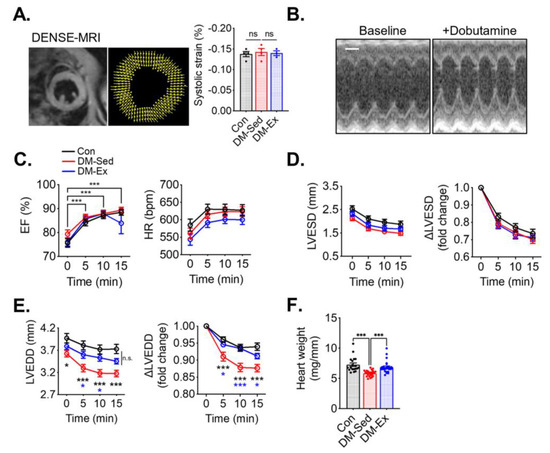 Exercise training mitigates diastolic dysfunction and cardiac atrophy in diabetic mice. (A) Example and results of LV systolic strain analysis from cardiac magnetic resonance imaging (MRI) with Displacement Encoding with Stimulated Echoes (DENSE) imaging. n.s., not significant. n = 4, 4, 3 for Con, DM-Sed, and DM-Ex groups, respectively. (B) Dobutamine stress echocardiogram. Representative images from a control mouse at baseline and 10 min post-i.p. injection of dobutamine (2.5 µg/g). scale bar, 1 mm. (C) Ejection fraction (EF) and heart rate (HR) in the dobutamine stress echocardiogram. ***, p < 0.001 compared with baseline from one-way ANOVA with post hoc multiple comparisons at respective time points. (D,E) Quantifications of LV end-systolic diameter (LVESD) and LV end-diastolic diameter (LVEDD). *, p < 0.05, ***: p < 0.001 compared with baseline in the same group, one-way ANOVA with post hoc multiple comparisons. (F) Heart weight (mg) normalized by tibial length (mm); n = 18, 24, 26 for Con, DM-Sed, and DM-Ex groups, respectively, ***: p < 0.001, one-way ANOVA with post hoc multiple comparisons.