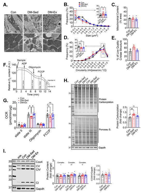 Transmission electron microscopy (TEM) was performed to evaluate the mitochondrial content and morphology in the left ventricle (LV) tissues of all groups. Mitochondrial content, size, circularity, and cristae quality were analyzed. Quantification of mitochondria by TEM did not show any significant changes in LV mitochondrial content (Figure 3A–E), which was confirmed by western blot analyses of mitochondrial electron transport chain proteins (Figure 3I). However, LVs of DM-Sed mice showed increased mitochondria with a lower cristae density (defined less than 50% of occupancy of clearly defined cristae structure in a mitochondrion), a higher degree of mitochondrial fragmentation (significantly more mitochondria with small cross-sectional area), and a more irregular shape based on circularity score (Figure 3A–E). Exercise training alleviated the cristae and size abnormality but not shape irregularity (Figure 3A–E). The oxygen consumption rate (OCR) of isolated cardiac mitochondria with pyruvate and malate as substrates was measured to evaluate mitochondrial respiration capacity (Figure 3F). DM-Sed mice showed a significantly reduced state III (stimulated by 5 mM ADP) and FCCP-induced respiration compared to control mice, which were completely restored by exercise training (Figure 3G). DM-Sed mice also exhibited heightened levels of oxidative stress as indicated by increased protein carbonylation with a clear trend of reduction toward the level of control mice following 6 weeks of voluntary running (Figure 3H).