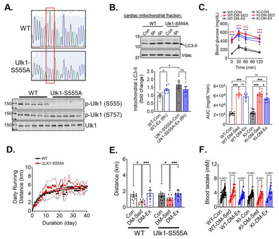 Ulk1 phosphorylation at S555 is required for acute exercise-induced mitophagy but not for exercise-mediated protection against exercise intolerance in diabetic mice. Top panel, the red box highlights the mutation of the S555 sequence. (A) Sequencing and western blot confirmation of ULK1-S555A generated by CRISPR/Cas9. (B) Exercise-induced mitophagy as indicated by western blot analyses of LC3 in centrifugation-isolated cardiac mitochondria. Ex (6 h), 6 h after an acute bout of exercise of 90 min treadmill running. n.s., not significant. (C) Glucose tolerance test of ULK1-S555A knock-in mice and their wildtype littermates after being subjected to the same diabetes and exercise intervention protocol. n = 7–15. n.s., not significant. ***: p < 0.0001 compared with control groups, two-way ANOVA with post hoc multiple comparisons. Some high data points were substituted with 650 mg/dL due to exceeding the upper limit of the glucometer. (D) The average daily running distance of the diabetic mice (WT-DM-Ex and KI-DM-Ex). The dotted lines denote the 95% confidence intervals of each group. (E,F) Treadmill running test results and blood lactate change before and after the running session to confirm exhaustion. *, p < 0.05; ***, p < 0.001, two-way ANOVA with post hoc multiple comparisons. n = 7–15.