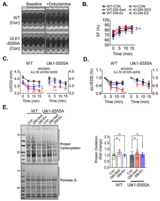 Ulk1-S555A mice retain exercise-mediated protection against diastolic dysfunction in diabetes. (A) Representative echocardiography images at baseline and 10 min post-i.p. injection of dobutamine (2.5 µg/g) of two control mice. Scale bar, 1 mm. (B–D) Ejection fraction (EF), LV end-diastolic diameter (LVEDD), and ∆LVEDD. n.s., not significant. *, p < 0.05, **: p < 0.01, ***: p < 0.001, two-way ANOVA with post hoc multiple comparisons at each time point. n = 7–15. (E) Western blot assessment of total protein carbonylation and quantification. n.s., not significant. *, p < 0.05, two-way ANOVA with post hoc multiple comparisons.