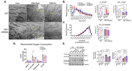 Ulk1-S555A mice retain exercise-mediated mitigation of mitochondrial abnormalities via alternative mechanisms. (A) Representative transmission electron microscopy (TEM) images of LV. Scale bar, 2 µm. n = 2. Yellow arrows, examples of very small (scattered) mitochondria. 5 randomly selected images from each mouse were quantified using FIJI. (B,C) Quantifications of size and circularity distributions TEM images. n.s., not significant. *, p < 0.05; **, p < 0.01, two-way ANOVA with post hoc multiple comparisons. (D) OCR results in the Ulk1-S555A mice. *, p < 0.05, one-way ANOVA with post hoc multiple comparisons. (E) Western blot assessment of heart lysates. *, p < 0.05; **, p < 0.01; ****, p < 0.0001, two-way ANOVA with post hoc multiple comparisons.