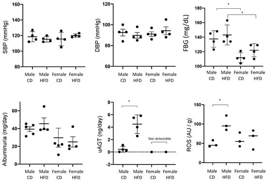Systolic blood pressure (SBP), diastolic blood pressure (DBP), fasting blood glucose (FBG), albuminuria, and urinary angiotensinogen (uAGT) after 8 weeks of high fat (HFD) or control diet (CD) in male and female mice. Tissue levels of reactive oxygen species (ROS) were measured at 28 weeks (see Section 3 and Section 4). * p < 0.05. Two-way ANOVA was used to analyze the effect of treatment and sex and multiple comparison analysis was performed to test differences among groups.