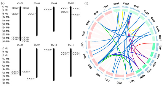 (a) Distribution of 23 ClChi genes on the watermelon chromosomes. The scale ruler on the left side shows the physical distance (Mb) of the chromosomes. The relative positions of the ClChis are marked on the chromosomes. (b) Syntenic relationships among the Arabidopsis, cucumber, and watermelon chitinase genes are indicated in different colors; Red: Arabidopsis vs. Arabidopsis; Green: watermelon vs. watermelon; Yellow: cucumber vs. cucumber; Blue: watermelon vs. cucumber; Dark blue: Arabidopsis vs. watermelon; Purple: Arabidopsis vs. cucumber.