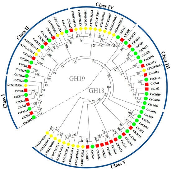 The neighbor-joining (NJ) method was used to build an unrooted phylogenetic tree that included the 24, 28, and 23 chitinase proteins from Arabidopsis, cucumber, and watermelon, respectively, to examine the evolutionary origin and putative function of the ClChi genes (Figure 2). The members of these chitinase were divided into the GH18 and GH19 glycosyl hydrolase families. Based on the phylogeny and sequence homology of Arabidopsis, this tree had five clades that were labeled as Class I, Class II, and Class IV that were members of GH19, and Class III and Class V that were members of GH18. As the largest clade, nine chitinase proteins of Arabidopsis, eight ClChi, and eight CsChi proteins were members of Class V. Class II and Class III each contained 15 members. A total of eleven and nine chitinase proteins were members of Class IV and Class I, respectively. Interestingly, in Class I, Class IV, and Class V, cucumber and watermelon had the same chitinase members.
