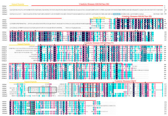 Multiple alignments of the GH18 chitinase Class III and Class V and the GH19 chitinase subfamily of the ClChis sequences. Orange and red lines over sequences indicate signal peptides and their catalytic domains. Blue box: Glycosyl hydrolases family 18 (GH18) active site signature PS01095. Black box: chitin binding domain signature PS00026. Red box: Chitinases family 19 signature 1, PS00773. Green box: Chitinases family 19 signature 2, PS00774. The position of the conserved serine (S), threonine (T), and tyrosine (Y) predicted to be the phosphorylation sites are indicated by the black triangles.