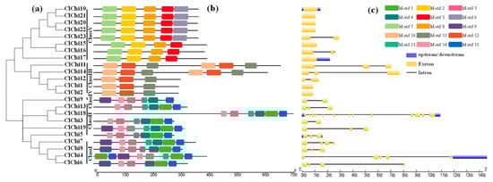 Phylogenetic relationships, conserved motifs, and gene structures of the watermelon chitinases. (a) Phylogenetic tree of 23 watermelon chitinase proteins. (b) Distribution of the conserved motifs in the watermelon chitinases. (c) Gene structure of the predicted ClChi genes. Yellow boxes and black lines represent exons and introns, respectively.