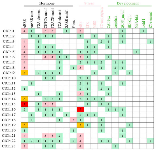 The sequences that were found 1.5 kb upstream from the start codon of the ClChi gene were submitted to the PlantCARE server to analyze the cis-acting elements bound in the promoter. cis-acting elements with more than 19 different functions that are involved in phytohormone response and defense and stress responsiveness, as well as the process of plant growth and development, were identified in the promoter region of ClChis (Figure 5). In detail, the cis-acting elements involved in the phytohormone response included the following: one abscisic acid-responsive element (ABRE), two auxin-responsive elements (AuxRR-core and TGA-element), one SA-responsive element (TCA-element), two MeJA-responsive elements (CGTCA-motif and TGACG-motif), and two gibberellin-responsive elements (GARE-motif and P-box). The predicted stress-related cis-acting element included one element involved in anaerobic induction (ARE), one low-temperature-responsive element (LTR), and two elements involved in defense and stress responsiveness (MBS and TC-rich repeats). Moreover, there were seven elements involved in different growth and development processes of the plant, including a CAT-box involved in meristem expression, Circadian-controlled differentiation of the palisade mesophyll, GCN4_motif involved in endosperm expression, HD-Zip I involved in the differentiation of the palisade mesophyll cells, and MSA-like involved in cells cell cycle regulation. Motif I is a root-specific regulatory element and an RY element involved in seed-specific regulation. More than one element belongs to phytohormone response and stress responsiveness, and the regulation of plant development can be found to occur in each promoter sequence, which suggests that the ClChis are involved in plant growth and development by responding to various environmental factors.