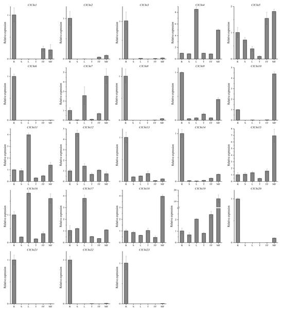 To investigate the potential functions of the ClChi genes in different tissues, the roots, stems, leaves, tendrils, female flowers, and male flowers were collected for real-time quantitative reverse transcription PCR (qRT-PCR) analysis. The levels of expression of the ClChi genes can be detected in most selected organs, but their levels of transcription varied (Figure 6). A total of 12 of the 23 ClChi members (ClChi1–3, 6, 8, 9, 13, 14, and 20–23) were primarily expressed in the roots compared to other organs, while more mRNA accumulated only in the stems in ClChi12. ClChi11 and 17 may play critical roles in leaves owing to the detection of their higher levels of expression in the leaves compared to other organs. There were five members (ClChi10, 15, 18, and 19) that were specifically expressed in the male flowers. Furthermore, the abundances of ClChi4, 7, and 16 transcripts were higher in the leaves and male flowers. These results indicate that different ClChi gene members are involved in different physiological and developmental processes of watermelon in varying tissues or organs.