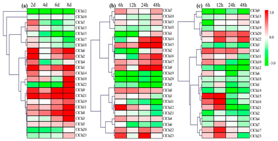 Heatmap of the expression of the ClChi genes in ‘M08’ under drought (a), salt (b), and low-temperature (c) stress. Red and green correspond to strong and weak expression of the ClChi genes, respectively. The plant samples at 0 dpt and 0 hpt were considered to be controls. dpt, days post-treatment; hpt, hours post-treatment.