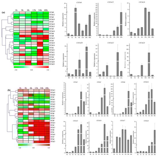 The chitinases involved in the responses to abiotic stress of various plants have been reported in previous studies. However, further study is needed to clarify the roles of ClChis in resisting external stress in watermelon. With drought treatment, the pattern of expression of the ClChi members varied considerably (Figure 7a). Among the 23 ClChi genes, the profiles of expression of 16 members (ClChi1–6, 8–11, 14, and 19–23) were upregulated with the increase in the time of drought treatment, and three (ClChi20, 22, and 23) of them were downregulated until 8 days post-treatment (dpt). In contrast, the transcription of four ClChi genes (ClChi7, 13, 17, and 18) increased slightly at the early stage and then reduced. ClChi12, 15, and 16 were responses to drought with low levels of expression throughout the process of treatment. The patterns of expression of the ClChi gene members were studied to determine their responsiveness to low-temperature treatment (Figure 7b). Under cold stress, eleven ClChi genes (ClChi3, 4, 7–9, 12, 13, 15, 17, 22, and 23) were immediately induced to be upregulated 6 h post-treatment (hpt), and six of these eleven members were consistently upregulated throughout the cold treatment (ClChi4, 7, 8, 15, 17, and 22). Conversely, twelve ClChi genes were detected with a low content of mRNA at 6 hpt, and seven of them were downregulated from the beginning to the end of the treatment (ClChi5, 6, 11, and 18–21). Moreover, high levels of ClChi14 and ClChi16 transcripts were detected until 24 and 48 hpt, and ClChi1, ClChi2, and ClChi10 were only upregulated 48 hpt. To predict the potential function of the ClChi genes in the response of watermelon to osmotic pressure, the patterns of expression of these genes were analyzed under salt stress. As shown in Figure 7c, eleven ClChi gene members reduced their levels of expression at the initial stage, and eight members were consistently under-expressed during the treatment (ClChi2–4, 9, 12, 14, 18, and 19). Of the remaining four genes, ClChi1 and ClChi7 only had relatively high levels of transcription 12 hpt. ClChi13 had a higher abundance of RNA transcription 24 and 48 hpt, and ClChi8 was only transcriptionally upregulated 48 hpt. Except for that, four members (ClChi5, 17, 20, and 22) had a higher content of mRNA at all times post-treatment. The significantly upregulated pattern of expression of four ClChi genes (ClChi10, 15, 16, and 21) were observed 6 and 12 hpt and then decreased. These results of expression under various abiotic stresses suggest that the ClChi genes act as important plant regulators.