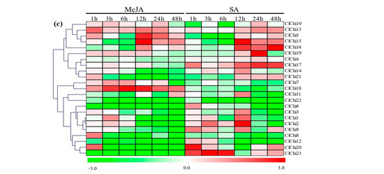 Heatmap of the levels of expression of the ClChi genes under ABA, ETH, MeJA, and SA hormone treatments. (a) Levels of expression of ClChis under ABA stress visualized as a heat map (Left). Detailed patterns of expression of the ClChis under ABA stress (Right). (b) Levels of expression of the ClChis under ETH stress visualized as a heat map (Left). Detailed patterns of expression of ClChis under ETH stress (Right). (c) Levels of expression of the ClChis under MeJA and SA stress visualized as a heat map. The plant samples at 0 dpt and 0 hpt were considered to be controls. ABA, abscisic acid; ETH, ethylene; MeJA, methyl jasmonate; SA, salicylic acid.