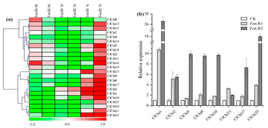 To examine the potential roles of the responses of the ClChi genes to biotic stress, a cultivated variety of watermelon designated ‘M08’ was infected with Fusarium oxysporum f. sp. niveum (Fon), the causal agent of Fusarium wilt in watermelon. This cultivar is resistant to Fon race 1 (R1) and susceptible to Fon race 2 (R2). Root tissue samples were independently collected from uninfected and infected plants to explore the patterns of expression of the ClChi genes. As shown in Figure 9, the upregulated transcription of nine (ClChi3, 5–7, 11, 12, 15, 16, and 19) and two (ClChi5 and 16) ClChi members were observed 0 dpt of infected R1 and R2, respectively. At 3 dpt, only ClChi1 and ClChi2 had accumulated mRNA, while the rest of members were downregulated. The levels of expression of 10 and 21 ClChi members (except for ClChi4 and 6) increased in the watermelon plants infected with R1 and R2 7 dpt, respectively. At 7 dpt of Fon infection, eight ClChi gene members (ClChi1, 2, 5, 8, 10, 13, 17, and 23) were significantly upregulated in the treatments of infection with both R1 and R2 (Figure 9b). Thus, the differential expression of the ClChi genes observed in response to infection with two different races of Fon suggests that these genes could play a vital role in the resistance of watermelon to pathogens.