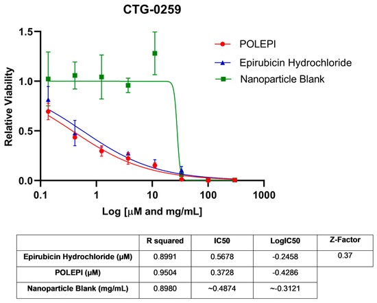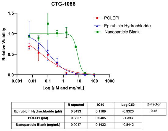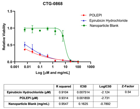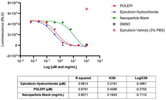 Each agent’s stock solution was prepared fresh at a suitable concentration to perform consistent dilutions for each replicate well. POLEPI was reconstituted with PBS pH 7.4 to prepare a working stock solution at a concentration of 2 mg/mL (3.45 mM) (calculated as epirubicin HCl content). NP Blank was reconstituted with PBS pH 7.4 to prepare a stock solution of 60.24 mg/mL.