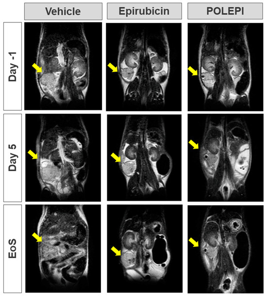 Orthotopic PDX tumor in Certis Orthotopic ovarian model visualized via MRI. Yellow arrow indicates tumor. EoS: Day 7–9; vehicle: AN#001 for Day-1, Day 5 and EoS; epirubicin: AN#022 for Day-1, Day 5 and EoS; and POLEPI: AN#011 for Day-1, Day 5 and EoS.