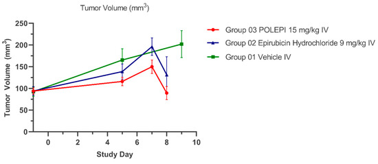 When the tumors reached a range of 55–162 mm3 with an average of 94 mm3, 30 mice were randomized to the respective treatment groups and dosed within 72 h. Day-1 is defined by randomization, and Day 0 is defined by dosing start. Group 1 (n = 10) received NP Blank, Group 2 EPI (Ellence, NDC 0009-5091-01, Pharmacia & Upjohn Company LLC, New York, NY, USA) at 9 mg/kg, and Group 3 POLEPI at 15 mg/kg. All injections were carried out via IV into the tail vein. Initially, all animals were to receive test articles weekly for 4 weeks. Clinical observations were performed twice weekly. The animals were checked for any signs of behavioral abnormalities, and clinical signs were recorded as observed. Body weights were measured twice weekly following the randomization and initiation of treatment. Starting on Study Day 2, body weights were taken daily for Group 2 EPI and Group 3 POLEPI due to body weight loss concerns. Starting on Study Day 5, body weights were taken daily for all animals, including Group 1 NP Blank. Body weight loss was calculated based on the body weight of the mouse on the first day of treatment (Study Day 0). Starting on Study Day 2, Diet Gel was given to all animals, as well as twice daily saline injections. Only one dose of a test agent was given on Study Day 0, and dosing holidays were given to all animals thereafter due to severe body weight loss. In total, 14 animals were euthanized when a body weight loss of >20% was observed.