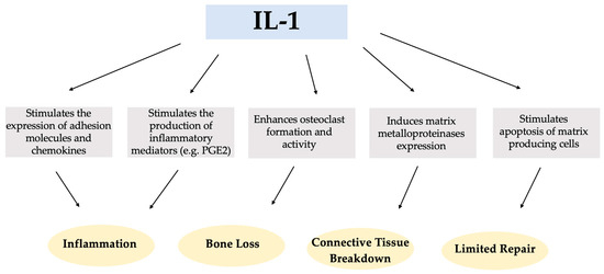 Several studies have reported higher levels of IL-1β and tumor necrosis factor-alpha (TNF-α) in the peri-implant crevicular fluid (PICF) of implants with peri-implantitis than in healthy implants [20,21,22,23,24]. IL-1β, a powerful pro-inflammatory protein, plays a crucial role in the inflammatory process that occurs in the oral cavity. It acts as a key mediator in the production of prostaglandins, leukotrienes, and platelet-activating factors in various cell types. In addition, IL-1β stimulates osteoclast formation and contributes to bone resorption [25,26]. IL-1β is one of the candidate biomarkers that has been identified as being strongly associated with an increase in immuno-infiltrating cells in soft tissue samples obtained from peri-implantitis sites [27]. Another pro-inflammatory cytokine, TNF-α, shares several functions with IL-1β [28,29]. TNF-α also stimulates bone resorption and fibroblast apoptosis, resulting in limited repair of the periodontium, and increasing local secretion and activity of metalloproteinases that degrade connective tissue [30,31].