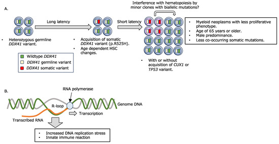 Involvement of DDX41 variants in myeloid leukemogenesis. (A) Myeloid neoplasms arising from DDX41 variants: Hematopoietic cells carrying a heterozygous germline DDX41 variant (depicted as cells with blue nuclei) undergo the development of myeloid neoplasms following the acquisition of a somatic variant in the initially wild-type DDX41 after a prolonged latent period (illustrated as cells with light purple nuclei). The proportion of tumor cells tends to be low, and these cells may disrupt normal hematopoiesis, which is sustained by cells with only a germline variant. (B) Effects of R-loop accumulation on cellular function: R-loops form when transcribed RNA hybridizes with template DNA. The inappropriate accumulation of R-loops leads to DNA replication stress, impacting cellular function.