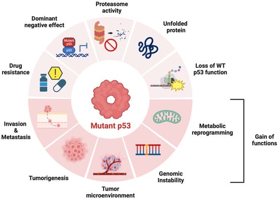 TP53 is one of the most frequently mutated genes, especially in adult-onset cancers. Genome sequencing of various human cancer cells has revealed that 42% of cases carry TP53 variants [92]. The p53 protein is a transcription factor that can activate the expression of multiple target genes, plays an important role in the regulation of the cell cycle, apoptosis, and genomic stability, and is widely known as “the guardian of the genome”(Figure 2) [93,94]. The evidence accumulated to date suggests that p53 also regulates cell metabolism, ferroptosis, tumor microenvironment, and autophagy, which each contribute to tumor suppression [94]. Genomic instability caused by deletions and variants in TP53 may lead to accumulated gene mutations, causing gain of function (GOF) in the oncogene and LOF in the tumor suppressor gene [95]. p53 variants confer metabolic plasticity to cancer cells, promoting adaptation to metabolic stress and increasing the possibility of proliferation and metastasis [96].