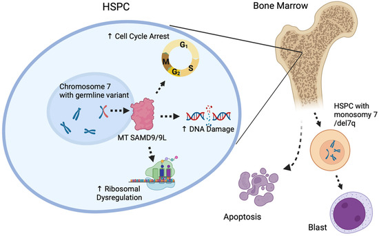 Germline variants in these genes are strongly associated with monogenic and familial pediatric MDS and potential full or partial deletions of adult chromosome 7(Figure 3) [53]. Germline variants in SAMD9 or SAMD9L are heterozygous gain-of-function missense variants, leading to proliferative arrest when expressed exogenously in the cell [174]. Carriers are at high risk for MDS and AML with cytopenia and monosomy 7/del7q. Many other patients who do not develop monosomy 7 acquire somatic variants in SAMD9 or SAMD9L resulting in the loss of function of the mutant protein [181]. The overexpression of SAMD9 or SAMD9L results in decreased proliferation and increased apoptosis, ultimately leading to the hypocellular phenotype being observed in patients. The effects on ribosome biology, DNA damage, and the resulting genomic instability are thought to promote the observed apoptotic phenotype [182,183] and ultimately lead to reduced bone marrow cellularity. Unrepaired DNA defects in hematopoietic cells cause significant long-term functional disruption and are a major driving force for the accumulation of further variants, thus promoting clonal expansion and malignant transformation [184,185,186].