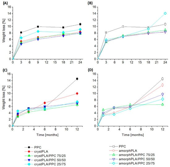 Weight loss of polymers and blends during incubation in soil and phosphate buffer. (A,B)—incubation in soil, (C,D)—incubation in buffer.