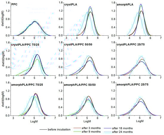 In the case of crystPLA/PPC blends, after 3 months of incubation in the soil, minimal changes in molecular weights were recorded; however, a significant decrease in the Mn value was visible after 9 months (75/25 > 50/50 > 25/75 by 64, 44, and 34%, respectively), which was accompanied by a doubling of the Đ value. After 18 months of degradation in the soil, a similar trend was revealed; however, both the Mn values and the nature of the elugram curves (shifting towards higher masses) of blends containing the highest PLA content (both crystalline and amorphous) indicate the leaching of low molecular degradation products of these blends into the soil, which, as a consequence, results in an increase in Mn and a lower Đ. The same type of degradation was observed for crystPLA and amorphPLA/PPC blends after 24 months. This means that in these blends (with a higher content of PPC), the washing out of the degradation products took longer than in the case of high amounts of PLA in the blend. This confirms the nature of elugram curves with essential tails toward low Mn (after 18 months) and no tail and shift toward a higher molecular weight (after 24 months). Comparing blends of PPC with amorphous and crystalline PLA, as expected, the first one degrades faster due to its higher diffusivity for water in contrast to the hindrance of water caused by the crystalline regions of crystPLA.