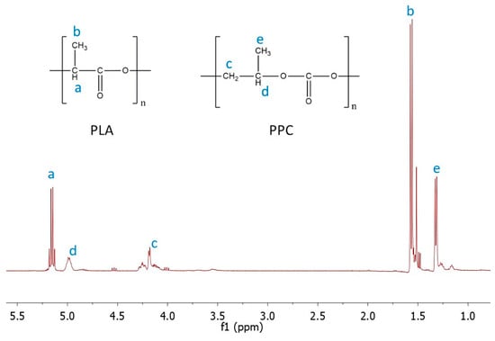 1H NMR spectrum of PLA/PPC blends with signals assigned to the appropriate protons: a, b correspond to proton signals assigned to -CH- and -CH3 groups of PLA, respectively, and c–e correspond to proton signals assigned to -CH2-, -CH- and -CH3 groups of PPC, respectively.