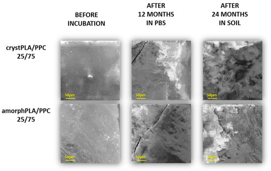 Figure 4 shows the most representative changes in the surface erosion of samples of degradation after 12 months in PBS and 24 months in soil. At the start of degradation, the surface of polymeric discs was quite smooth and nonporous; however, along with progress in time, we observed progress in surface degradation that was more and more visible as irregular defects such as splits and cracks. Among pure polymers, the highest surface erosion after incubation in soil can be observed for pure PPC (Figure S2). The erosion of the PLA film is visible to a greater extent for the amorphPLA than for the crystPLA. However, blends of samples with a predominance of PLA showed a higher degree of surface erosion than both pure PLA samples. Particular defects in the surface are visible for pure PPC and blends (crystPLA/PPC 25/75, amorphPLA/PPC 25/75), which contain a larger content of PPC. Polymeric samples immersed in PBS mostly undergo hydrolytic degradation, which is possible due to the penetration of water molecules into the polymeric matrix and the cleavage of bonds in polymer chains. This type of degradation has less impact on the surface of the sample. In the case of soil, the activity of microorganisms considerably increased, and therefore, enzymatic degradation resulted in surface erosion. In relation to this, two types of degradation processes in the tested polymeric samples have been observed. In the first, which is hydrolytic degradation, the bonds of the main polymer chains are cleaved, thereby reducing the size of the polymer chain. The second, which is enzymatic degradation, occurs via surface erosion, where microorganisms start consuming polymers enzymatically from the surface, thereby causing a significant decrease in the weight of the polymeric sample.