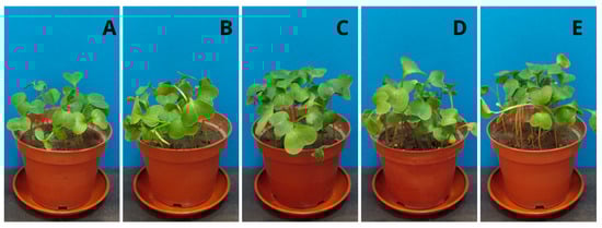 Radish seedlings (Raphanus sativus): (A) control sample (without PPC), (B) 250 mg, (C) 500 mg, (D) 750 mg, and (E) 1000 mg of PPC/kg soil dry matter.