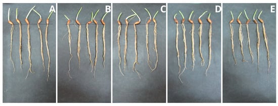 Root systems of oat seedlings (A. sativa): (A) control sample (without PPC), (B) 250 mg, (C) 500 mg, (D) 750 mg, and (E) 1000 mg of PPC/kg soil dry matter.