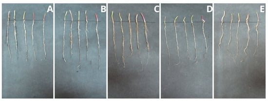 Root systems of radish seedlings (R. sativus): (A) control sample (without PPC), (B) 250 mg, (C) 500 mg, (D) 750 mg, and (E) 1000 mg of PPC/kg soil dry matter.