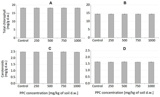 Chlorophyll plays a crucial role in photosynthesis and supports plant growth, and, together with carotenoids, it is a sensitive indicator of the damaging impact of various biotic and abiotic stresses on leaf function and health [,]. Analysis of the level of assimilation dyes treated with PPC in the soil did not show a significant effect, regardless of the concentration introduced into the soil. Both chlorophyll and carotenoids remained at levels comparable to those of control plants. This means that this polymer does not negatively affect plant photosynthetic pigments. The obtained results coincide with the phytotoxicological study of PLA films, which we already reported []. Plant growth tests performed with cress (Lepidium sativum) and barley (Hordeum vulgare) confirmed that PLA and its degradation products were completely non-toxic to the tested plants. The same is true for natural polyhydroxybutyrate and its atactic and amorphous analogue, amorphPHB. With this respect, PPC can be successfully used for agricultural and agrochemical purposes. Obviously, more comprehensive studies are still required; however, for the first time, according to our knowledge, a phytotoxicological study of PPC was conducted.