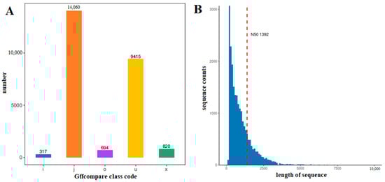 Adaptor sequences, duplicated sequences and low-quality reads were excluded. The filtered data were qualitatively controlled using fastqc, and the StringTie software (Version: 2.1.4; Parameter: default) was used to assemble the transcripts. In total, 25,306 transcripts were obtained. Among them, ‘o’ is other overlapped parts of the same chain with reference exons, with a total of 694; ‘j’ is for multiple exons with at least one match, of which there are 14,060; ‘x’ is exon overlap on the antichain; ‘i’ is completely contained in the intron of the reference transcript; and ‘u’ is 9415 unknown new transcripts. TransDecoder was used to predict the encoding region of a new transcript. The results showed that the length of the unigenes was mainly between 100 and 1500 bp, and the length of the N50 was 1392 bp (Figure 1).