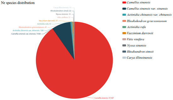 Nr annotated species distribution map in C. sinensis. The top 10 species with the most comparisons were counted, and the numbers represent the numbers of different species in the Nr database, while different colors represent different species. The species distribution of BLAST hits for each unigene was determined with a cut-off of 1 × 10−5.
