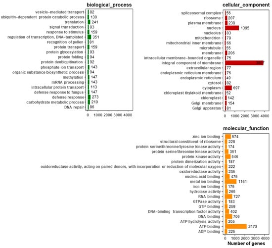 Gene Ontology (GO) is an international standard classification system of gene function. The GO database was used to classify the annotated tea transcriptome data. A total of 14,615 unigenes of C. sinensis had Gene Ontology (GO) annotations. GO describes gene function from three aspects: cellular component (CC), molecular function (MF) and biological process (BP). The top 20 most common GOslim secondary categories in each category were selected for plotting (Figure 3). Among them, transcription regulation & DNA—templated (351), defense response (273) and translation (241) involved the largest number of differentially expressed gene transcripts (DETs). Among the cell components, the integral components of the membrane (3857), nucleus (1395) and cytoplasm (697) were involved in the most DETs. The most common terms in molecular functions were ATP binding (2173), metal ion binding (1161) and RNA binding (727).