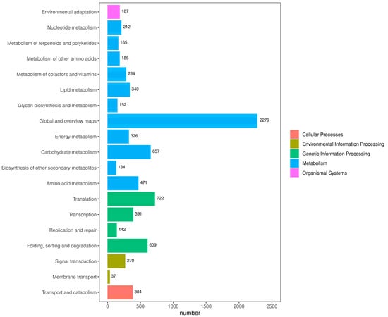 After KEGG annotation of transcript sequences, they were classified according to the KEGG metabolic pathways in which they participated, and the results are shown in Figure 4. A total of 10,443 DETs were annotated. This classification is divided into five levels: cellular processes, environmental information processing, genetic information processing, metabolism and organismal systems. The largest level of these was metabolism, which had 11 sublevels. Among the 11 sublevel metabolic pathways were global and overview maps (2279), carbohydrate metabolism (657) and amino acid metabolism (471). In the processing of genetic information, translation (n = 722) and folding, sorting and degradation (n = 609) occupied large proportions.