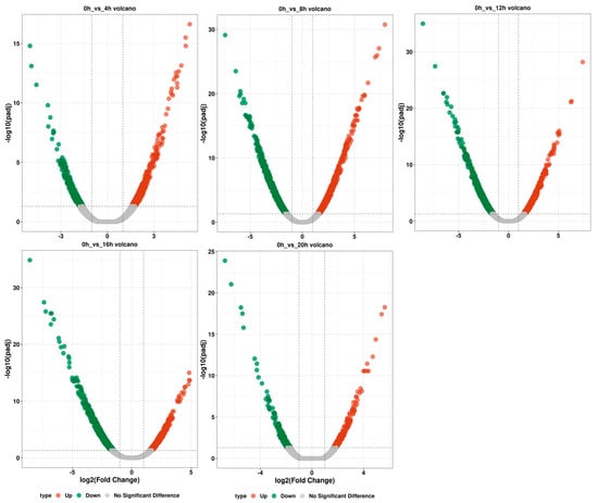 In our differential expression analysis, the expression levels of the gene transcripts in each sample were obtained through expression quantitation of read count data. A total of 772, 2411, 1731, 1434 and 393 differentially expressed gene transcripts were identified in “0 h_vs._4 h”, “0 h_vs._8 h”, “0 h_vs._12 h”, “0 h_vs._16 h” and “0 h_vs._20 h.” In “0 h_vs._4 h”, a total of 469 differentially expressed gene transcripts were upregulated and 303 were downregulated. In “0 h_vs._8 h”, a total of 1215 differentially expressed gene transcripts were up- and 1196 downregulated. In “0 h_vs._12 h”, a total of 697 differentially expressed gene transcripts were up- and 1034 downregulated. In “0 h_vs._16 h”, a total of 532 differentially expressed gene transcripts were up- and 902 downregulated. In “0 h_vs._20 h”, a total of 235 differentially expressed gene transcripts were up- and 158 downregulated (Figure 5).