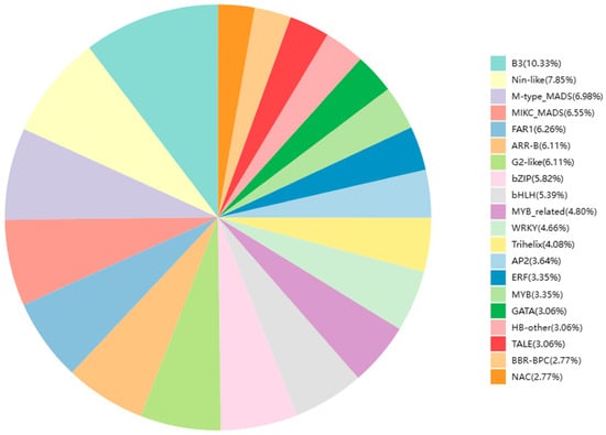 Analysis of transcription factor families in C. sinensis. Different colors represent different families of transcription factors, and the numbers in brackets indicate the proportions to the total differential transcription factors.