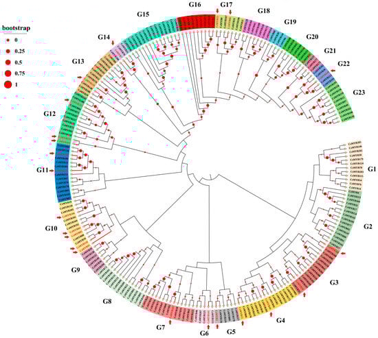 A total of 222 MYB transcription factors were retrieved from the TPIA database. Multiple sequence alignment was performed on those, and an NJ phylogenetic tree was generated based on the alignment results (Figure 7). The results showed that tea plant MYB members can be divided into 23 subfamilies, named Groups 1 to 23. The 22 selected DETs encoding MYB and MYB-related transcription factors related to the circadian rhythm of tea plants were distributed among the different subfamilies. The numbers of DET MYB transcription factors belonging to the G10, G11 and G12 groups were higher than those in the other groups. Among them, the G10 group had the highest number of transcripts (a total of five) associated with the circadian rhythm. In the G1, G2, G8, G9, G15, G16, G18, G19, G20, G21 and G23 groups, no member was associated with the circadian rhythm.