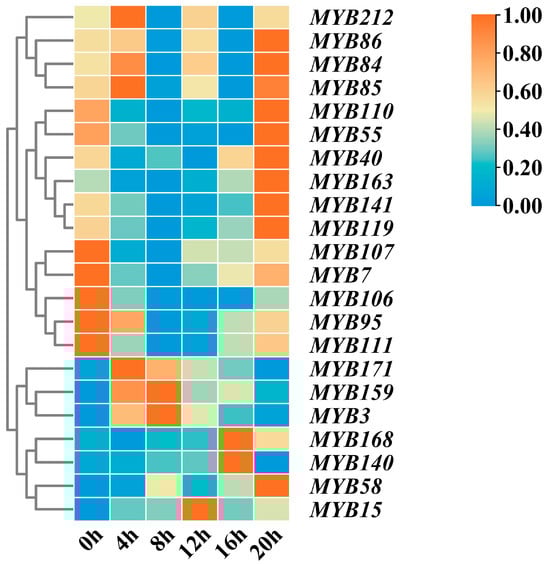 DETs encoding transcription factors were predicted using PlantTFDB [56]. The top 20 transcription factor families with differential expression were selected for plotting, and the proportion statistics are shown in Figure 6. A total of 894 DETs encoding transcription factors were detected, the most abundant of which were the B3 (71) and Nin-like (54) transcription factor families. Twenty-three MYB transcription factors and thirty-three MYB-related transcription factors were identified, accounting for 3.35% and 4.80% of the total differentially expressed transcription factors (894), respectively. According to the results of transcription factor annotation, DETs with transcription factor annotation information were further screened, and duplicate transcription factors were removed. A total of 22 transcripts of the MYB transcription factors were obtained for subsequent analysis. We identified one upregulated and four downregulated unigenes in “0 h_vs._4 h”; two upregulated and twelve downregulated unigenes in “0 h_vs._8 h”; one upregulated and eight downregulated unigenes in “0 h_vs._12 h”; one upregulated and eight downregulated unigenes in “0 h_vs._16 h”; and one upregulated and zero downregulated unigenes in “0 h_vs._20 h.”