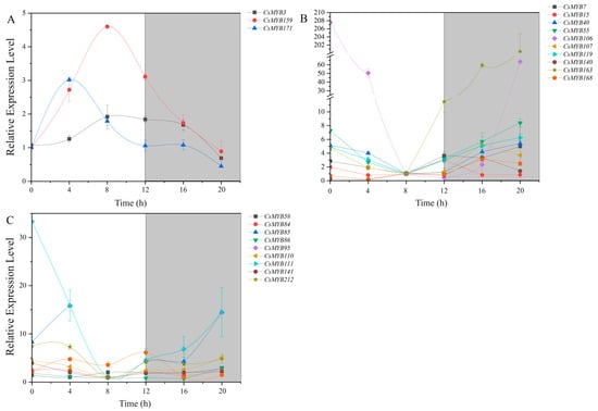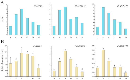 When studying the RPKM (Figure 9A) and quantitative RT-PCR (Figure 9B) results, it was found that the expression levels of MYB3, MYB159 and MYB171 gene transcripts were high in the day and low at night. The MYB3 and MYB159 gene transcripts reached a peak value at 8 h and the lowest value at 20 h. The expression levels of MYB3 and MYB159 at the peak value were 2.78 and 5.17 times higher than that of the lowest value, respectively. The MYB171 transcript reached its peak value at 4 h and reached its lowest value at 20 h, which was 6.71 times higher. The expression level of MYB171 at the peak value was 6.71 times higher than that at the lowest value. The transcript levels of MYB3, MYB159 and MYB171 first increased and then decreased, which had a certain regularity (Figure 10A).