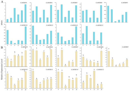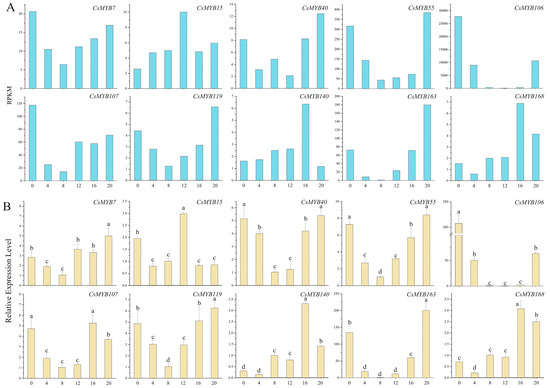The expression levels of CsMYB gene transcripts with irregular expression profiles in C. sinensis within a photoperiod. (A): Reads per kilobase per million mapped reads. (B): Real-time PCR. The standard deviation (SD) is represented by the error bars. Different lowercase letters indicate significant differences at the 0.05 level.