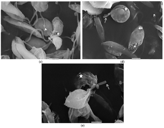 Compound 8 induced several ultrastructural changes in L. mexicana promastigotes, as evidenced by SEM (Figure 1). SEM analysis of the non-treated parasites showed a typical elongate morphology of promastigotes with their anterior flagella (Figure 1a); meanwhile, the treated parasites showed a rounded shape (Figure 1b–e), profound alterations in their membranes (Figure 1b–d), membrane blebbing (Figure 1b,d,e) and flagella length reduction as well as a bulbous structure at the flagella tip (Figure 1b–e).