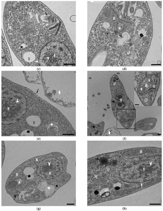 TEM analysis of L. mexicana promastigotes: non-treated (a) and treated with compound 8 at 0.32 µM 6 h (b–d) and 3.2 µM for 12 h (e–h). Control parasites show a normal morphology. Parasites treated with compound 8 show the presence of autophagosomes (APs) (d,f,h) and several alterations such as flagellar membrane detachment (black arrow) and exocytic activity in the flagellar pocket (black arrowhead) (b), kinetoplast structural alterations (c), mitochondrion swelling and concentric membranes inside (asterisks) (d,f,g), chromatin condensation (white arrowhead) (c,e,g,h), rupture of nuclear membrane (white arrow) (c,g,h), plasmatic membrane detachment (black arrow) (e) and cytoplasmic myelin figures (white stars) (e,g); loss of cell integrity and cytosolic content (white rhombus) (e,f); nucleus (N), mitochondrion (M), flagella (F), flagellar pocket (FP), kinetoplast (K), acidocalcisome (Ac), lipid body (LB), vacuole (V) (bar = 0.5 µm).
