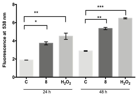Generation of ROS by L. mexicana promastigotes: control or treated with compound 8 (IC50 value) and hydrogen peroxide (100 µM) for 24 and 48 h. Values are expressed as units of fluorescence emitted by the probe H2DFFDA at 538 nm. * p ≤ 0.004. ** p ≤ 0.001. *** p ≤ 0.0002.