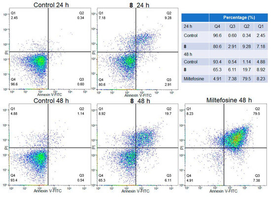 The biparametric representation (Annexin V-FITC versus PI) obtained from the flow cytometry assay of L. mexicana promastigotes treated with compound 8 (IC50 value) at different times (24 and 48 h) is shown in Figure 4. Parasites without treatment and parasites treated with Miltefosine were included as negative and positive controls, respectively. The control parasites showed 96.6% and 93.4% viability at 24 and 48 h; meanwhile, the promastigotes treated with compound 8 showed lower numbers of viable cells and a higher number of apoptotic cells in comparison with the control parasites. Parasite viability from 24 h to 48 h of treatment was reduced from 80.6% to 65.3%; meanwhile, early apoptotic cells increased from 2.91% to 6.11%, and late apoptotic cells increased from 9.28% to 19.7%. The positive control showed a high percentage of parasites (79.5%) in the late apoptotic phase.